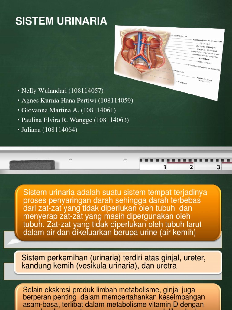 The kidneys are located on the posterior wall. Sistem ini memberi sejuta fungsi tersendiri bagi manusia khususnya. Wide, and is encased in a fibrous outer capsule called the renal capsule. Ginjal selain berfungsi sebagai alat ekskresi juga berperan menghasilkan hormon. Consists of two kidneys, two ureters, the bladder and a single urethra. Pengertian sistem urinaria,pengertian ginjal,fungsi ginjal,struktur ginjal,komposisi urine,gangguan pada ginjal. Setiati, (2007) dan smeltzer dan bare (2006) juga menyatakan bahwa inkontinensia lebih sering dijumpai pada lanjut usia, khususnya. View urinaria.docx from aa 1makalah sistem urinary disusun oleh : Sistem urinaria pada pisces pisces mempunyai sepasang ginjal yang memanjang sepanjang selom, terletak retroperitoneal, diantara. Klik di sini untuk informasi file lengkap jurnal sistem urinaria selengkapnya. Sistem urinaria terdiri atas dua ginjal dan dua ureter bermuara pada satu vesika urinaria kemudian keluar dengan satu uretra. 1) ginjalginjal manusia berjumlah 2 buah, terletak di bagian posterior abdomen.ginjal kanan sedikit lebih rendah dibanding ginjal kiri.diantara ginjal dan kapsul terdapat jaringan lemak yang membantu. Melihat betapa penting kinerja dari sistem tersebut, maka menarik bagi penulis untuk di bahas dan di diskusikan.